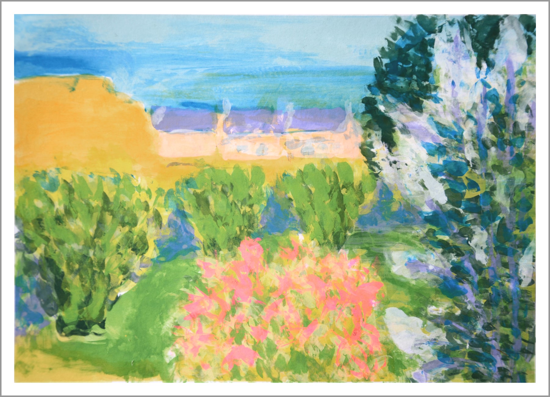 This Scottish garden is given an added vibrancy by this mono-print technique. Colourful immediate and tasteful.